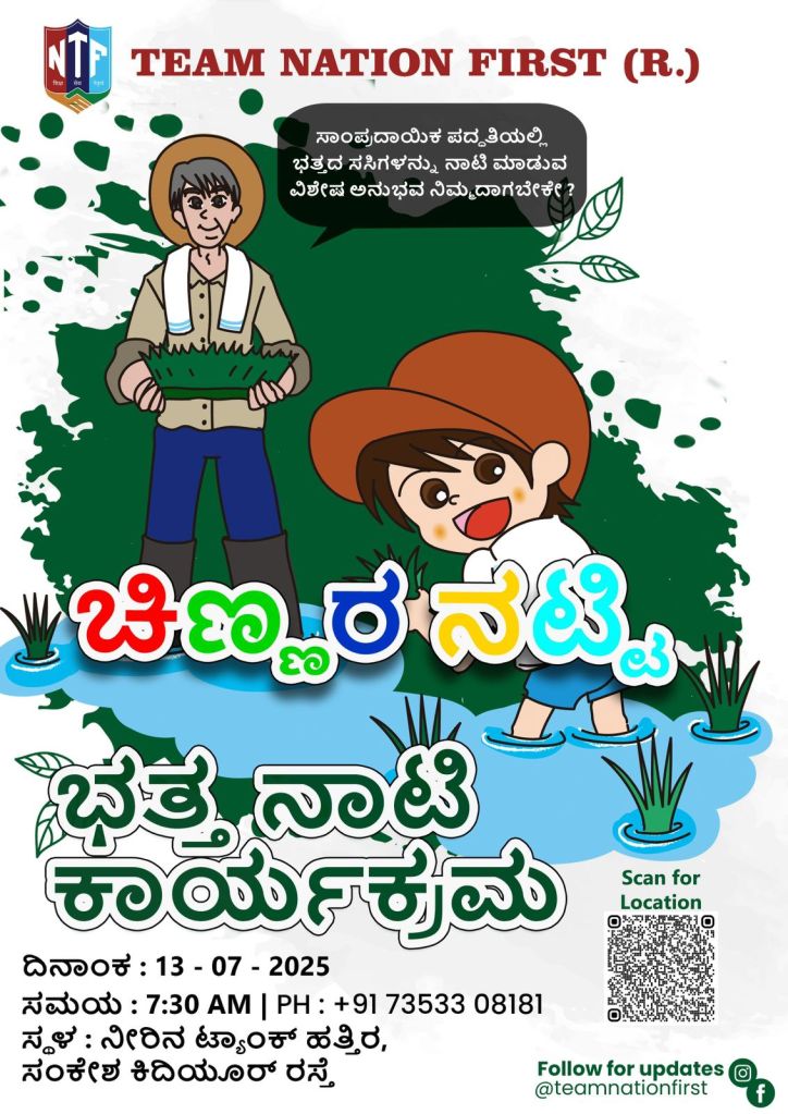 ಟೀಮ್ ನೇಷನ್ ಫಸ್ಟ್(ರಿ) ತಂಡವು ಪ್ರತಿ ವರ್ಷದಂತೆ ಈ ವರ್ಷವೂ “ಚಿಣ್ಣರ ನಟ್ಟಿ” ಕಾರ್ಯಕ್ರಮವನ್ನು 13 ಜುಲೈ ಭಾನುವಾರದಂದು ಕಿದಿಯೂರಿನ ಹೊಸ ವಾಟರ್ ಟ್ಯಾಂಕ್ ನ ಬಳಿ ಆಯೋಜಿಸಲಿದ್ದಾರೆ ಎಂದು ಅಧ್ಯಕ್ಷರಾದ ಸೂರಜ್ ಕಿದಿಯೂರ್ ಪ್ರಕಟಣೆಯಲ್ಲಿ ತಿಳಿಸಿದರು. ಈ ಕಾರ್ಯಕ್ರಮದಲ್ಲಿ ಉಡುಪಿ ತಾಲೂಕಿನ 300- 350 ವಿದ್ಯಾರ್ಥಿಗಳು ಪಾಲುಗೊಳ್ಳರಿದ್ದಾರೆ. ಬೆಳಿಗ್ಗೆ 7:30ರಿಂದ ಸಂಜೆ 5ರವರೆಗೆ ಕಾರ್ಯಕ್ರಮ ನಡೆಯಲಿದ್ದು ಸಾರ್ವಜನಿಕರ ಪಾಲುಗೊಳ್ಳುವಿಕೆಗೂ ಅವಕಾಶ ಇದೆ ಎಂದು ತಿಳಿಸಿದ್ದಾರೆ. ವಿಶೇಷವಾಗಿ ಮಕ್ಕಳಿಗೆ ಸಾಂಪ್ರದಾಯಿಕ ಪದ್ಧತಿಯಲ್ಲಿ ಭತ್ತದ ನಾಟಿ ಮಾಡುವ ಅವಕಾಶ ಹಾಗು ಸಮಾಜದಲ್ಲಿ ಕೃಷಿಯ ಪ್ರಾಮುಖ್ಯತೆಯ ತಿಳುವಳಿಕೆ ಮೂಡಿಸುವ ಉದ್ದೇಶದಿಂದ ಈ ಕಾರ್ಯಕ್ರಮವನ್ನು ಹಮ್ಮಿಕೊಳ್ಳಲಾಗಿದೆ. ಹೆಚ್ಚಿನ ಮಾಹಿತಿಗಾಗಿ ಸೂರಜ್ ಕಿದಿಯೂರ್ – 7353308181 ಇವರನ್ನು ಸಂಪರ್ಕಿಸಿ.