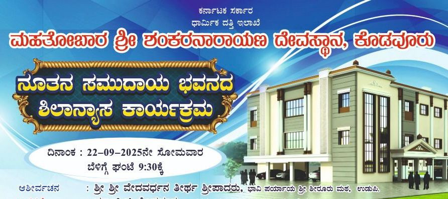 ಮಲ್ಪೆ ಸೆ. 20,ಕೊಡವೂರು ಶ್ರೀ ಶಂಕರನಾರಾಯಣ ದೇವಸ್ಥಾನದ ವತಿಯಿಂದ ನಿರ್ಮಾಣಗೊಳ್ಳಲಿರುವ ನೂತನ ಸಮುದಾಯ ಭವನಕ್ಕೆ ಸೆ. 22, ಸೋಮವಾರ ಬೆಳಿಗ್ಗೆ 9.30ಕ್ಕೆ ಶೀರೂರು ಮಠದ ಶ್ರೀ ವೇದವರ್ಧನ ತೀರ್ಥ ಶ್ರೀಪಾದರು ಶೀಲಾನ್ಯಾಸ ನೆರವೇರಿಸಲಿದ್ದಾರೆ.