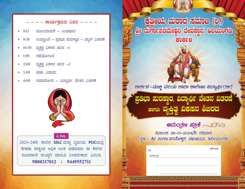 ಕ್ಷತ್ರೀಯ ಮರಾಠ ಸಮಾಜ ರಿ ಕಾರ್ಕಳ ಇದರ ಆಶ್ರಯದಲ್ಲಿ ಕಾರ್ಕಳ ಮುಲ್ಕಿ ವಲಯ ಸಮಾಜ ಬಂಧುಗಳಿಗೆ ಪ್ರತಿಭಾ ಪುರಸ್ಕಾರ, ಬ್ಯಾಗ್ ಮತ್ತು ವಿದ್ಯಾರ್ಥಿ ವೇತನ ವಿತರಣೆ ಹಾಗೂ ವ್ಯಕ್ತಿತ್ವ ವಿಕಸನ ಶಿಬಿರ