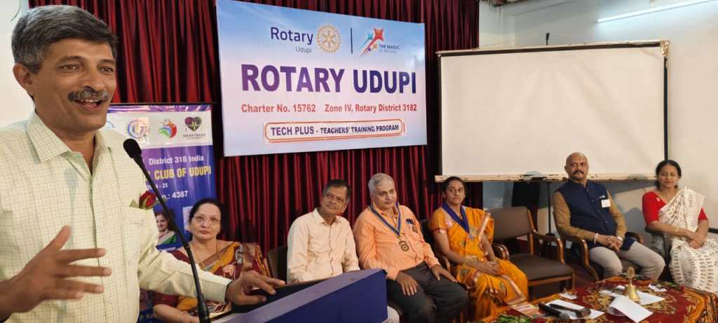 ರೊಟರಿಉಡುಪಿ ಮತ್ತು ಇನ್ನರ್ ವೀಲ್ ಕ್ಲಬ್ ಅವರ ಜಂಟಿ ಆಶ್ರಯ ದಲ್ಲಿ ನಡೆದ ಟೆಕ್ ಪ್ಲಸ್ ಶಿಕ್ಷಕರ ತರಬೇತಿ ಕಾರ್ಯಕ್ರಮ ದಲ್ಲಿ ಮುಖ್ಯ ಭಾಷಣಕಾರರಾಗಿ ಉಡುಪಿ ಡಯಟ್ ನ ಉಪಪ್ರಾಂಶುಪಾಲ ಡಾ ಅಶೋಕ್ ಕಾಮತರು ಮಾತನಾಡುತ್ತಾ ಶಿಕ್ಷಕರು ಬದಲಾಗುವ ಪರಿಸ್ಥಿತಿ ಯಲ್ಲಿ ತಮ್ಮನ್ನುಒಗ್ಗಿಸಿಕೊಂಡು ಸೂಕ್ತಜ್ಞಾನವನ್ನು ಪಡೆದು ವಿದ್ಯಾರ್ಥಿಗಳನ್ನು ತಯಾರು ಮಾಡಬೇಕೆಂದು ಕರೆನೀಡಿದರು. ಉಡುಪಿ ಡಯಟ್ ಅನುದಾನ ರಹಿತ ಶಾಲಾಶಿಕ್ಷಕರಿಗೂ ತರಬೇತಿ ನೀಡುತ್ತಾ ಇದೆ. ಅದರ ಸಂಪೂರ್ಣ ಉಪಯೋಗ ಪಡೆಯುವಂತೆ ತಿಳಿಸಿದರು. ಪ್ರಾರಂಭದಲ್ಲಿ ಇನ್ನರ್ ವೀಲ್ ಅದ್ಯಕ್ಷೆ ಸುರೇಖ ಕಲ್ಕೂರ್ ಸ್ವಾಗತಿಸಿದರು. ಸೋದೆ ವಾದಿರಾಜಮಠ ಟ್ರಸ್ಟ್ ನ ಕಾರ್ಯದರ್ಶಿ ರತ್ನಕುಮಾರ್ ಅವರು ಉದ್ಘಾಟಿಸಿ ರೋಟರಿಯು ಇಂತಹ ಕಾರ್ಯಕ್ರಮ ಆಯೋಜಿಸಿದ ಬಗ್ಗೆ ಅಭಿನಂದಿಸಿ ಇದರ ಸಂಪೂರ್ಣ ಸದುಪಯೋಗ ಪಡೆಯುವಂತೆ ಕರೆನೀಡಿದರು.ರೋಟರಿ ಅದ್ಯಕ್ಷ ರೋ. ಗುರುರಾಜ ಭಟ್ ಸಹಕರಿಸಿದ ಎಲ್ಲರನ್ನೂ ಅಭಿವಂದಿಸಿ ಭವಿಷ್ಯದ ಪ್ರಜೆಗಳನ್ನು ಹೊಸ ತಂತ್ರಜ್ಞಾನದಲ್ಲಿ ಪರಿಣಿತರಾಗುವಂತೆ ಮಾಡುವ ನಮ್ಮಪ್ರಯತ್ನದಲ್ಲಿ ಎಲ್ಲರು ಸಹಕರಿಸಬೇಕೆಂದು ಕರೆನೀಡಿದರು. ವಲಯ ಸೇನಾನಿ ಹೇಮಂತಕಾಂತ್ ಕಾರ್ಯಕ್ರಮ ಕ್ಕೆ ಶುಭ ಕೋರಿದರು. ಕಾರ್ಯದರ್ಶಿ ರೋ. ವೈಷ್ಣವಿ ಆಚಾರ್ಯ ದನ್ಯವಾದ ಸಮರ್ಪಿಸಿದರು. ರೋ.ರಾಮಚಂದ್ರ ಉಪಾಧ್ಯಾಯ ಕಾರ್ಯಕ್ರಮ ನಿರೂಪಿಸಿದರು. ಶ್ರೀಮತಿ ಶಬನಮ್ ಪ್ರವೀಣ್ ಶೇಖ್ ಅವರು ಇಂಗ್ಲೀಷ್ ವಿಷಯದ ಬಗ್ಗೆ ಶ್ರೀ ಗಣೇಶ್ ಶಟ್ಟಿಗಾರ್ ಗಣಿತದ ಬಗ್ಗೆ ಮತ್ತು ಡಯಟ್ ನ ಉಪನ್ಯಾಸಕ ಶ್ರೀ ಯೋಗನಾರಸಿಂಹ ಅವರು ಶಿಕ್ಷಣ ದಲ್ಲಿ ತಂತ್ರಜ್ಞಾನ ದ ಉಪಯೋಗದ ಬಗ್ಗೆ ತರಬೇತಿ ನೀಡಿದರು. ಸಮಾರೋಪ ಸಮಾರಂಭದಲ್ಲಿ ಶ್ರೀಮತಿ ರೂಪಾ ಕಿಣಿಯವರು ಮಾತಾಡುತ್ತಾ ಭಾಗವಹಿಸಿದ ಎಲ್ಲಾ ಶಿಕ್ಷಕರು ಇಲ್ಲಿ ಪಡೆದ ತರಬೇತಿಯ ಸಂಪೂರ್ಣ ಉಪಯೋಗ ಪಡೆದು ರೋಟರಿಯ ಈ ಪ್ರಯತ್ನದ ಯಶಸ್ಸಿನಲ್ಲಿ ಸಹಕರಿಸಬೇಕೆಂದು ಕರೆನೀಡಿದರು. ರೋಟರಿ ಮತ್ತು ಇನ್ನರ್ ವೀಲ್ ಸಂಸ್ಥೆಯ ಅನಂತರಾಮ ಬಲ್ಲಾಳ, ಸುಬ್ರಹ್ಮಣ್ಯ ಕಾರಂತ್, ಪದ್ಮಿನಿ ಭಟ್, ಶುಭ ಬಾಸ್ರ್ರಿ, ಸಾದನಾ ಮುಂಡ್ಕೂರ್, ವನಿತಾ ಉಪಾಧ್ಯಾಯ, ಶಾಲಿನಿ ರಾಘವೇಂದ್ರ ಮತ್ತು ಕಡಿಯಾಳಿ ಶಾಲೆಯ ಆಡಳಿತ ಅಧಿಕಾರಿ ಪ್ರಭಾವತಿ ಅಡಿಗ ಉಪಸ್ಥಿತರಿದ್ದರು.
