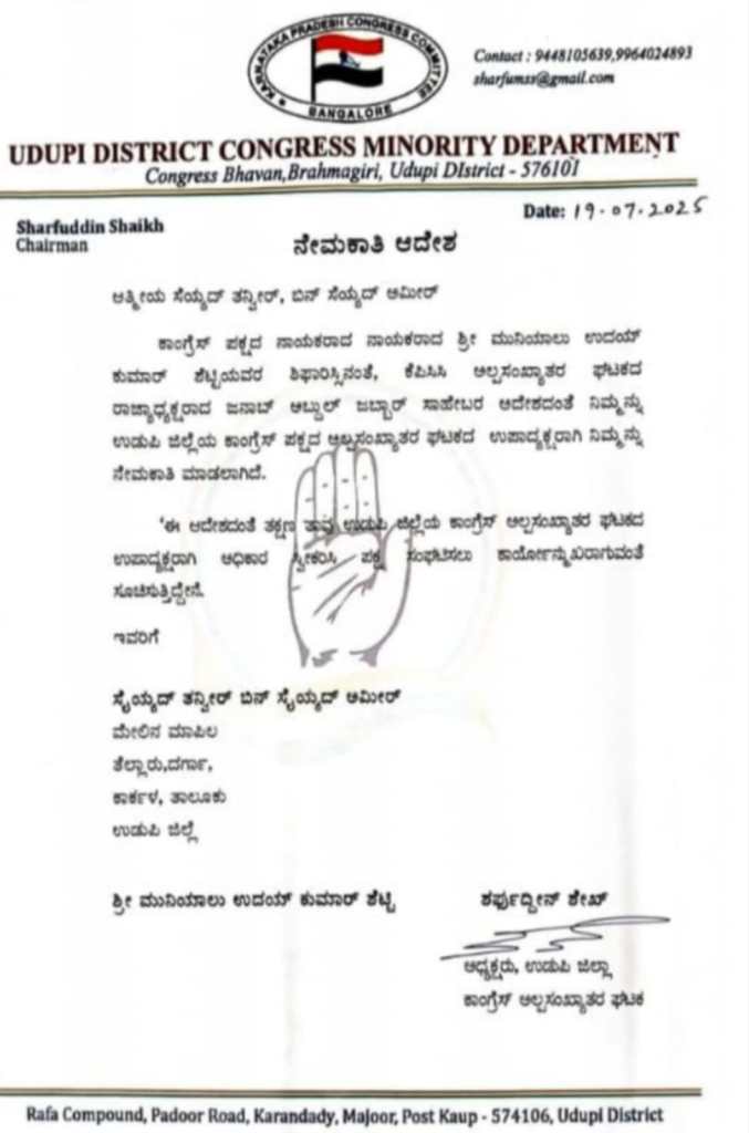 ಕಾರ್ಕಳ : ದುರ್ಗಾ ತೆಳ್ಳಾರು ಸೈಯ್ಯದ್ ತಸ್ವೀರ್ ಅವರು ಕಾಂಗ್ರೆಸ್ ಪಕ್ಷದ ಉಡುಪಿ ಜಿಲ್ಲಾ ಅಲ್ಪಸಂಖ್ಯಾತರ ಘಟಕದ ಉಪಾದ್ಯಕ್ಷರಾಗಿ ನೇಮಕಗೊಂಡಿದ್ದಾರೆ. ಕಾಂಗ್ರೆಸ್ ಪಕ್ಷದ ನಾಯಕ ನಾಯಕ ಮುನಿಯಾಲು ಉದಯ್ ಕುಮಾರ್ ಶೆಟ್ಟಿಯವರ ಶಿಫಾರಿಸ್ಸಿನಂತೆ, ಕೆಪಿಸಿಸಿ ಅಲ್ಪಸಂಖ್ಯಾತರ ಘಟಕದ ರಾಜ್ಯಾಧ್ಯಕ್ಷ ಅಬ್ದುಲ್ ಜಬ್ಬಾರ್ ಸಾಹೇಬರ ಆದೇಶದಂತೆ ಆಯ್ಕೆ ಪ್ರಕ್ರಿಯೆ ನಡೆದಿದೆ.