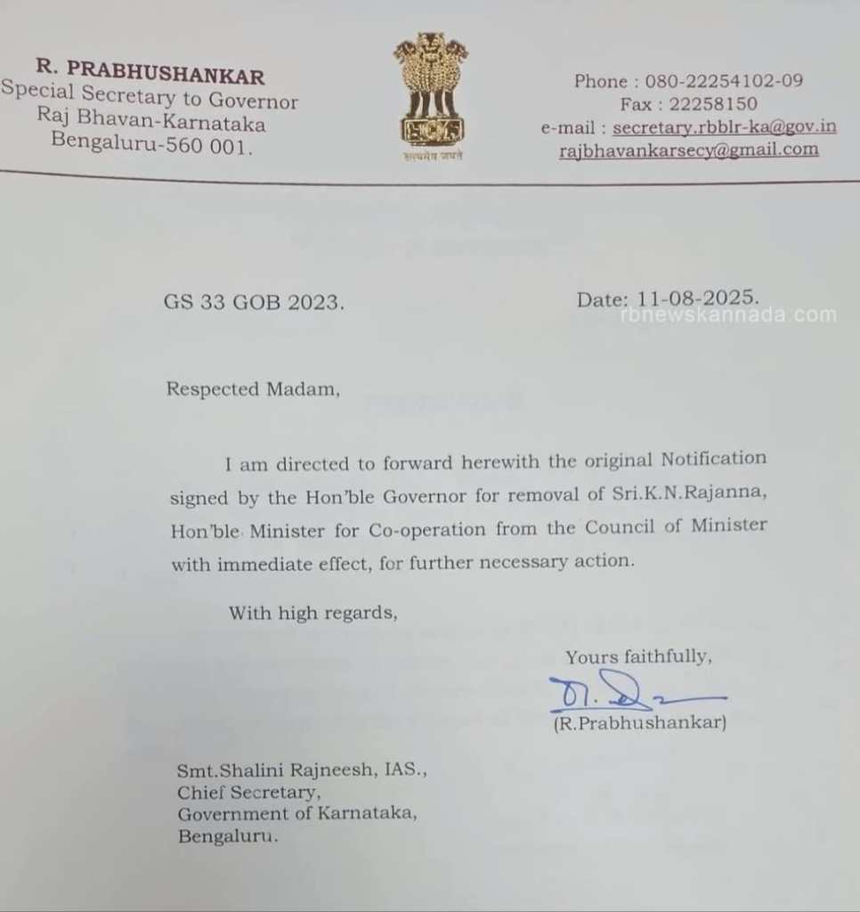 ಮುಂದಿನ ಅಗತ್ಯ ಕ್ರಮಕ್ಕಾಗಿ, ಸಹಕಾರ ಸಚಿವ ಕೆ.ಎನ್.ರಾಜಣ್ಣ ಅವರನ್ನು ಸಚಿವ ಸಂಪುಟದಿಂದ ತಕ್ಷಣದಿಂದ ಜಾರಿಗೆ ಬರುವಂತೆ ತೆಗೆದುಹಾಕುವ ಕುರಿತು ರಾಜ್ಯಪಾಲರು ಸಹಿ ಮಾಡಿದ ಮೂಲ ಅಧಿಸೂಚನೆಯನ್ನು ಈ ಪತ್ರದೊಂದಿಗೆ ಕಳುಹಿಸಲು ನನಗೆ ನಿರ್ದೇಶಿಸಲಾಗಿದೆ ಎಂದು ಪತ್ರದಲ್ಲಿದೆ. ರಾಜೀನಾಮೆ ನೀಡಿದ ರಾಜಣ್ಣ ಹೈಕಮಾಂಡ್ ಸೂಚನೆ ನೀಡಿದ ಬೆನ್ನಲ್ಲೇ ಶಾಸಕ ಕೆಎನ್ ರಾಜಣ್ಣ ಅವರು ಸೋಮವಾರ (ಆ.11) ಮಧ್ಯಾಹ್ನ ಸಚಿವ ಸ್ಥಾನಕ್ಕೆ ರಾಜೀನಾಮೆ ನೀಡಿದರು. ಕೆ.ಎನ್.ರಾಜಣ್ಣ ನೀಡಿದ ರಾಜೀನಾಮೆ ಪತ್ರವನ್ನು ಮುಖ್ಯಮಂತ್ರಿ ಸಿದ್ದರಾಮಯ್ಯ ಅವರು ಅಂಗೀಕರಿಸಿ, ರಾಜ್ಯಪಾಲ ಥಾವರ್ ಚಂದ್ ಗೆಹೋಟ್ ಅವರಿಗೆ ಕಳುಹಿಸಿದರು. ರಾಜ್ಯಪಾಲ ಥಾವರ್ ಚಂದ್ ಗೆಹೋಟ್ ಅವರು ಕೆಎನ್ ರಾಜಣ್ಣ ರಾಜೀನಾಮೆಯನ್ನು ಅಂಗೀಕರಿಸಿದರು.